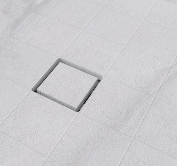 Grilă de duș pătrată complet integrată în finisajul tăvii de duș încorporate.